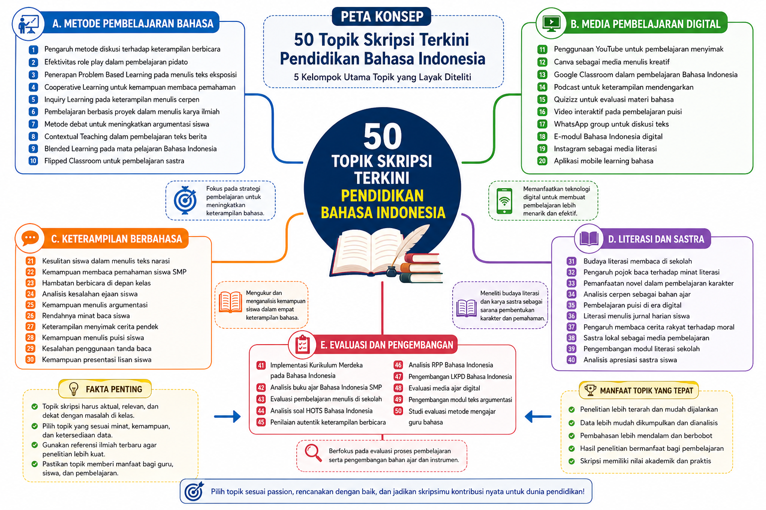 Karena itu, pemilihan judul sebaiknya tidak hanya didasarkan pada contoh skripsi lama, tetapi mempertimbangkan masalah nyata, kemudahan data, dan manfaat hasil penelitian. Dari 50 topik skripsi terkini Pendidikan Bahasa Indonesia di atas, mahasiswa dapat menentukan judul yang bukan hanya mudah dikerjakan, tetapi juga mampu memberi kontribusi positif bagi proses pembelajaran bahasa di sekolah.