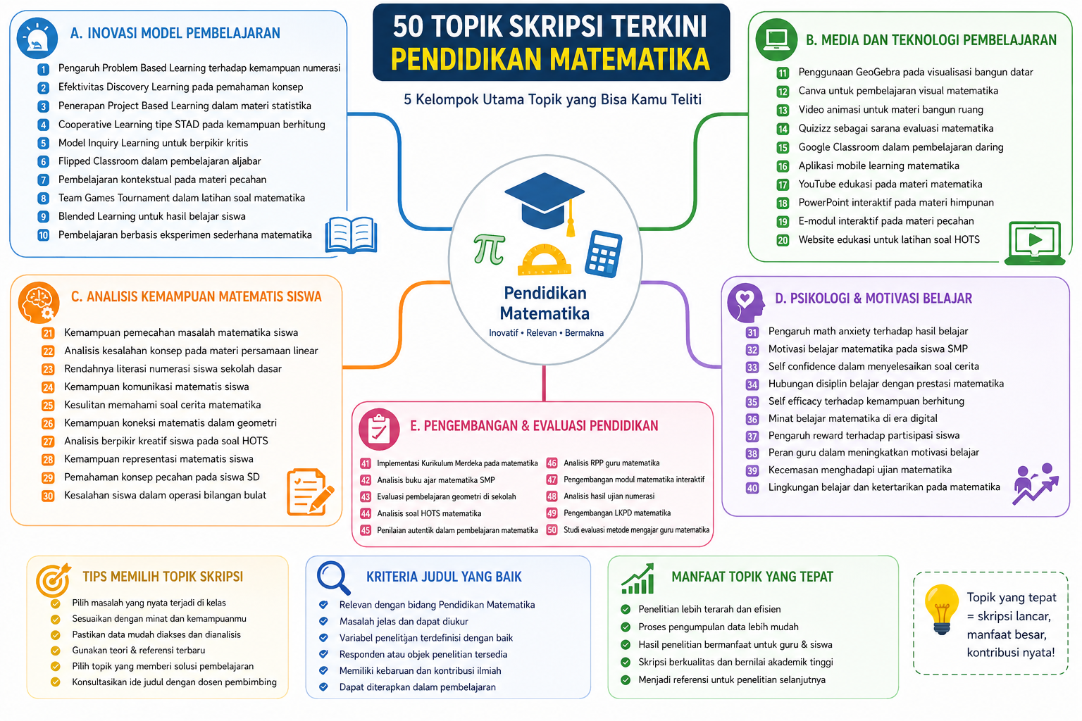 Pilihan topik di atas menunjukkan bahwa penelitian Pendidikan Matematika tidak melulu tentang nilai ujian, tetapi juga mencakup strategi mengajar, kesiapan siswa, hingga inovasi perangkat belajar. Dengan memilih tema yang sesuai, mahasiswa dapat menghasilkan penelitian yang lebih menarik dan tidak monoton.