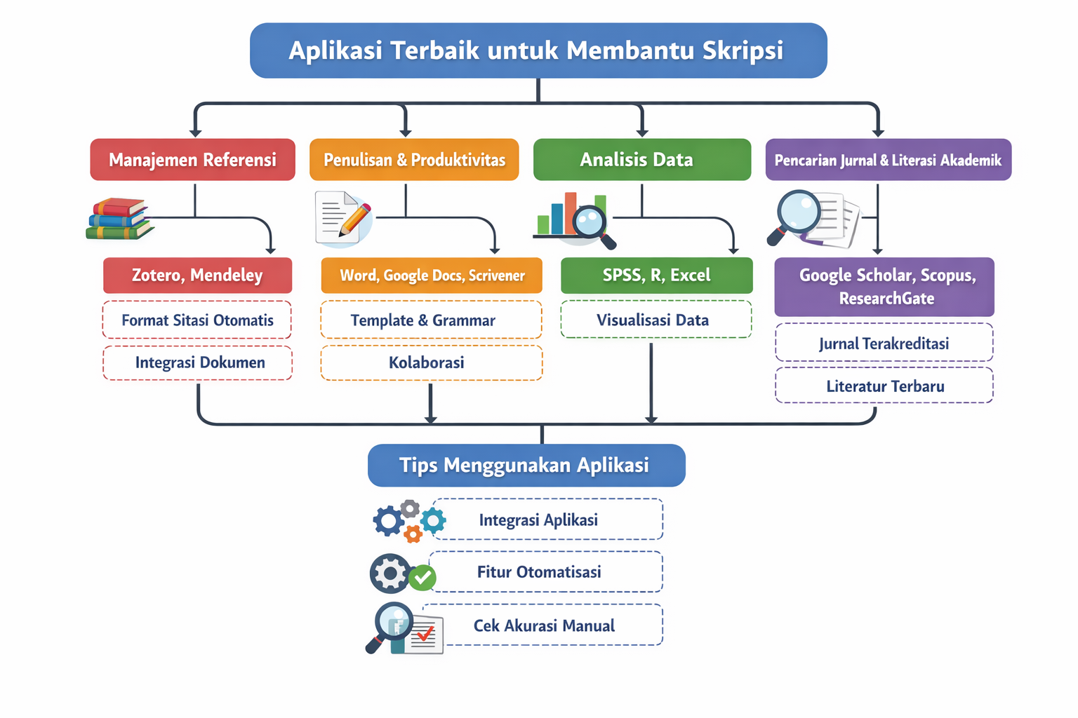 Agar penggunaan aplikasi menjadi lebih optimal, mahasiswa perlu menerapkan strategi yang tepat selama proses penulisan skripsi. Salah satu tips utama adalah mengintegrasikan beberapa aplikasi dalam satu workflow yang efisien. Misalnya, menggunakan aplikasi manajemen referensi bersamaan dengan aplikasi penulisan dan analisis data sehingga setiap tahap penelitian saling terhubung dan meminimalkan pekerjaan ganda.