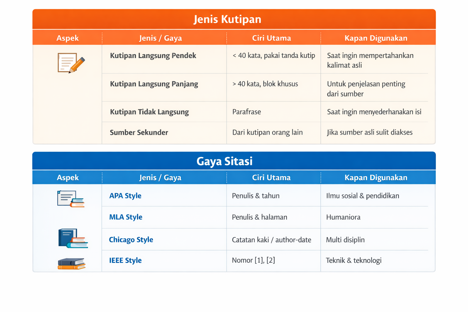 Dengan memahami perbedaan masing-masing jenis kutipan tersebut, penulis dapat memilih teknik yang paling sesuai untuk memperkuat argumen sekaligus menjaga kejelasan dan kerapian struktur penulisan ilmiah.