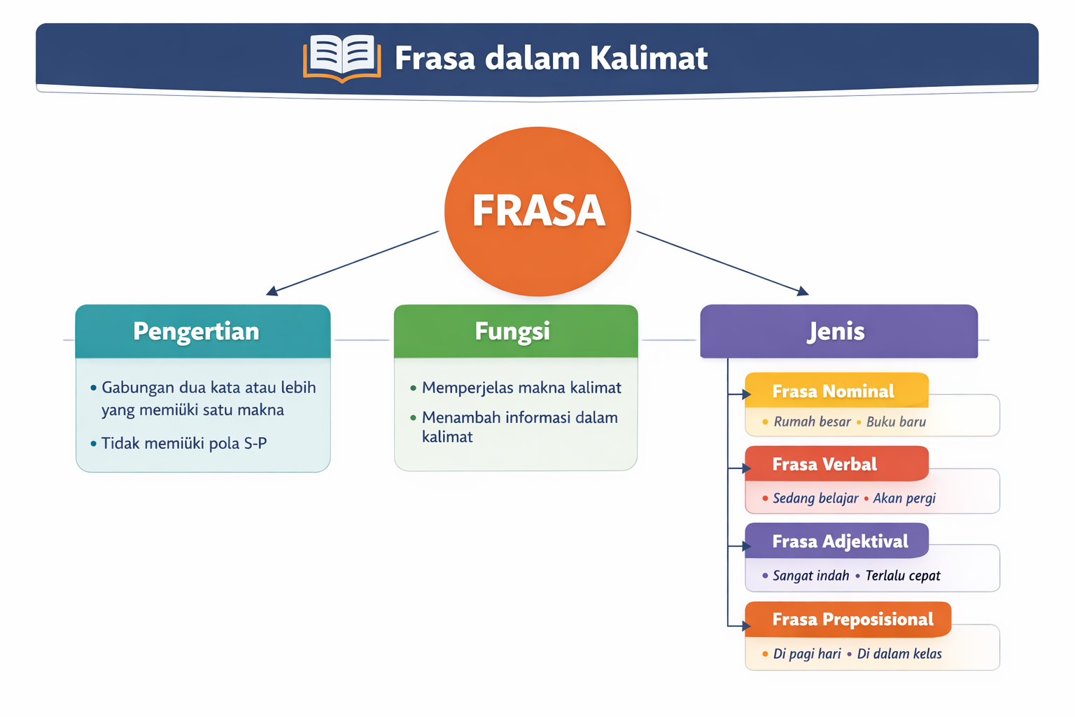 Dalam pembelajaran bahasa Indonesia, frasa merupakan salah satu unsur penting yang membantu membentuk kalimat yang jelas dan bermakna. Secara umum, frasa adalah gabungan dua kata atau lebih yang membentuk satu kesatuan makna gramatikal. Meskipun terdiri dari beberapa kata, frasa tidak membentuk hubungan subjek dan predikat seperti yang terdapat pada klausa.