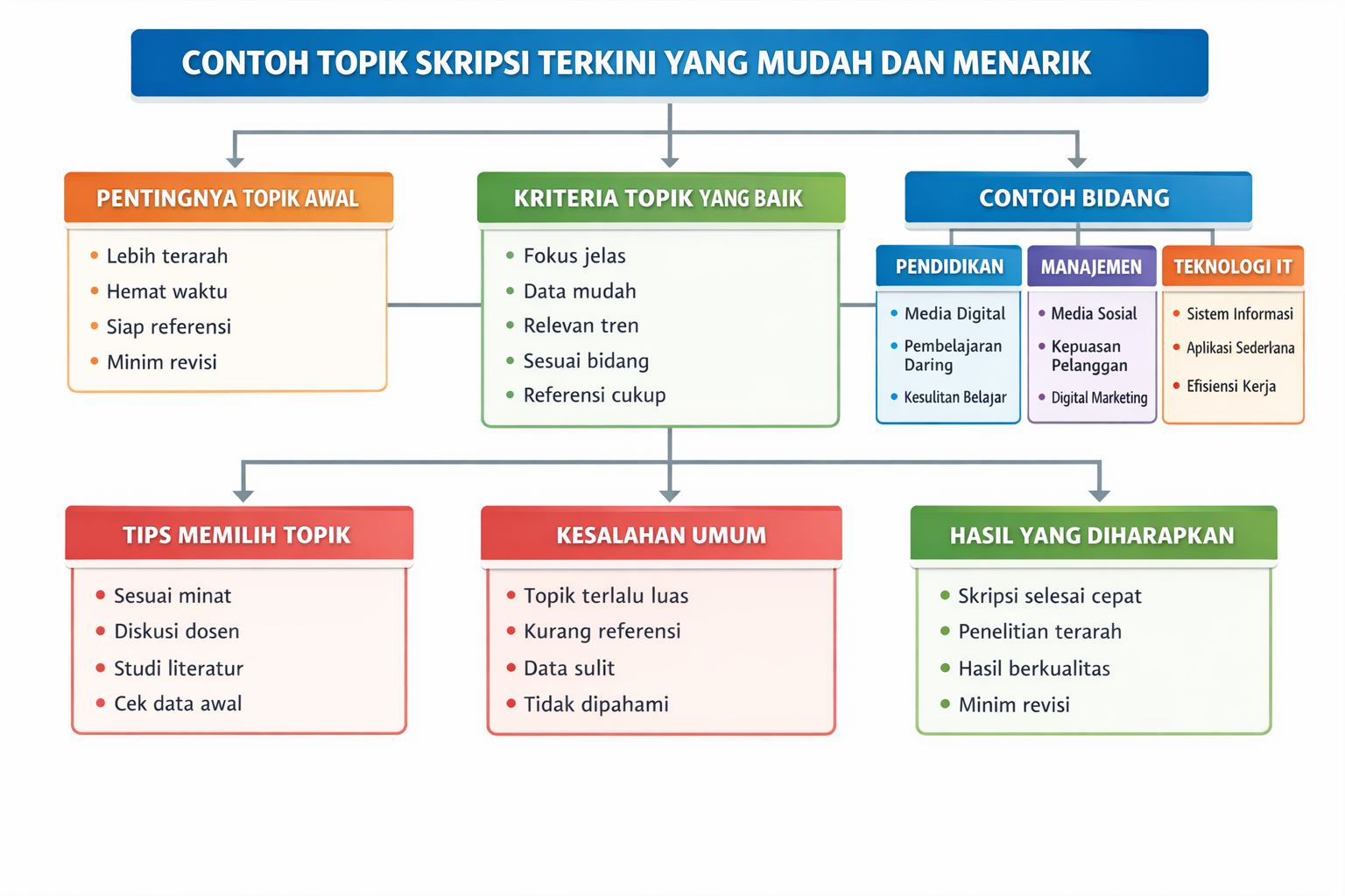 Pemilihan topik skripsi merupakan langkah awal yang sangat menentukan keberhasilan penelitian. Topik yang mudah dan menarik tidak hanya dilihat dari tingkat kesulitannya, tetapi juga dari relevansi, ketersediaan data, serta kesesuaian dengan minat mahasiswa. Dengan memahami kriteria dan melihat contoh dari berbagai bidang, mahasiswa dapat menentukan topik yang lebih tepat dan realistis.