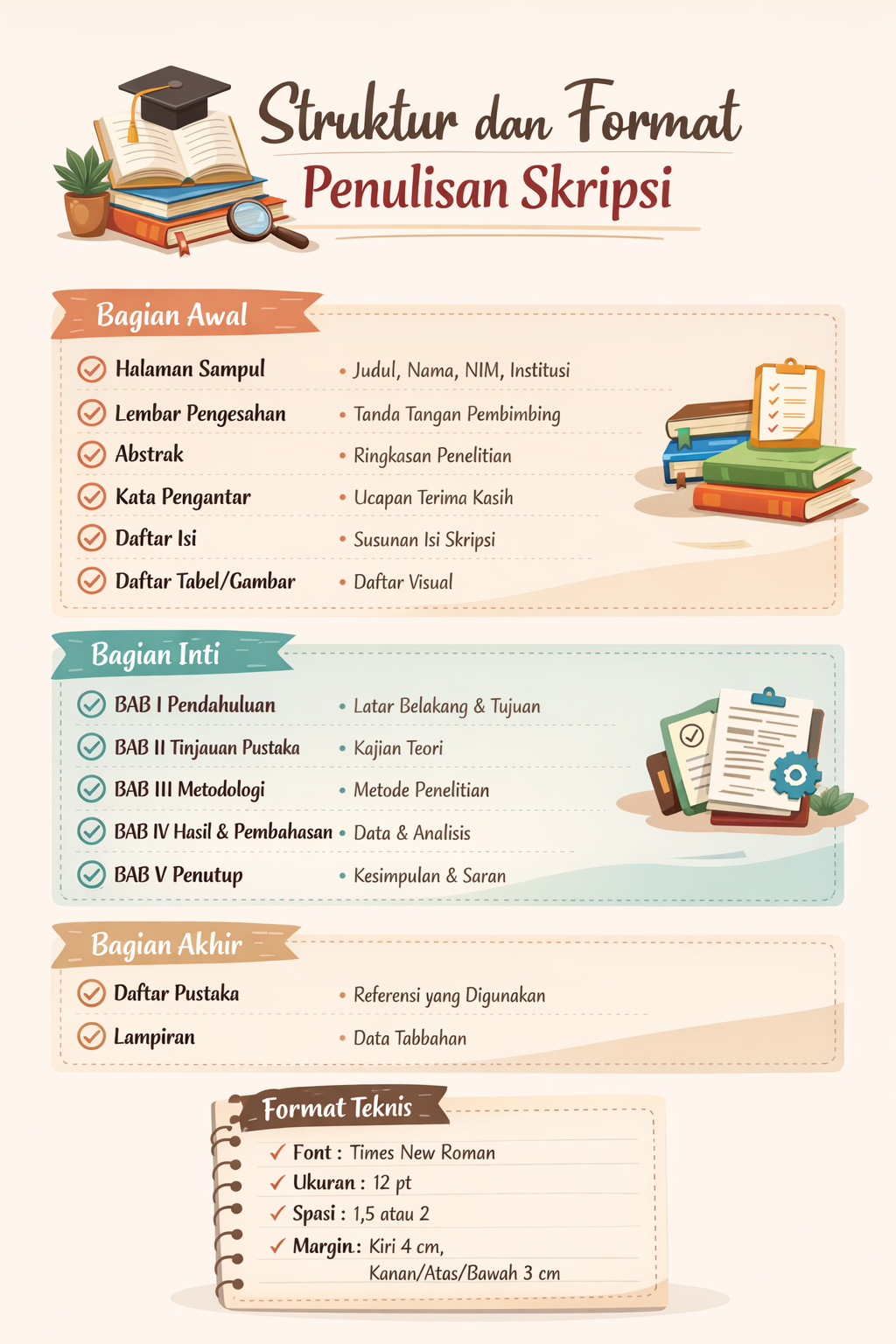 Dengan memahami struktur ini secara rinci, mahasiswa dapat menyusun skripsi dengan alur yang logis dan mudah dipahami.