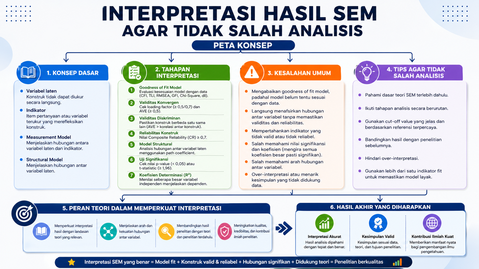 Oleh sebab itu, artikel ini akan membahas secara rinci bagaimana cara menginterpretasikan hasil SEM dengan benar agar tidak terjadi kesalahan analisis. Pembahasan akan dimulai dari konsep dasar hingga tahapan interpretasi, termasuk kesalahan umum yang sering terjadi dan tips praktis untuk menghindarinya. Dengan demikian, peneliti diharapkan mampu menghasilkan kesimpulan yang valid, reliabel, dan sesuai dengan tujuan penelitian.