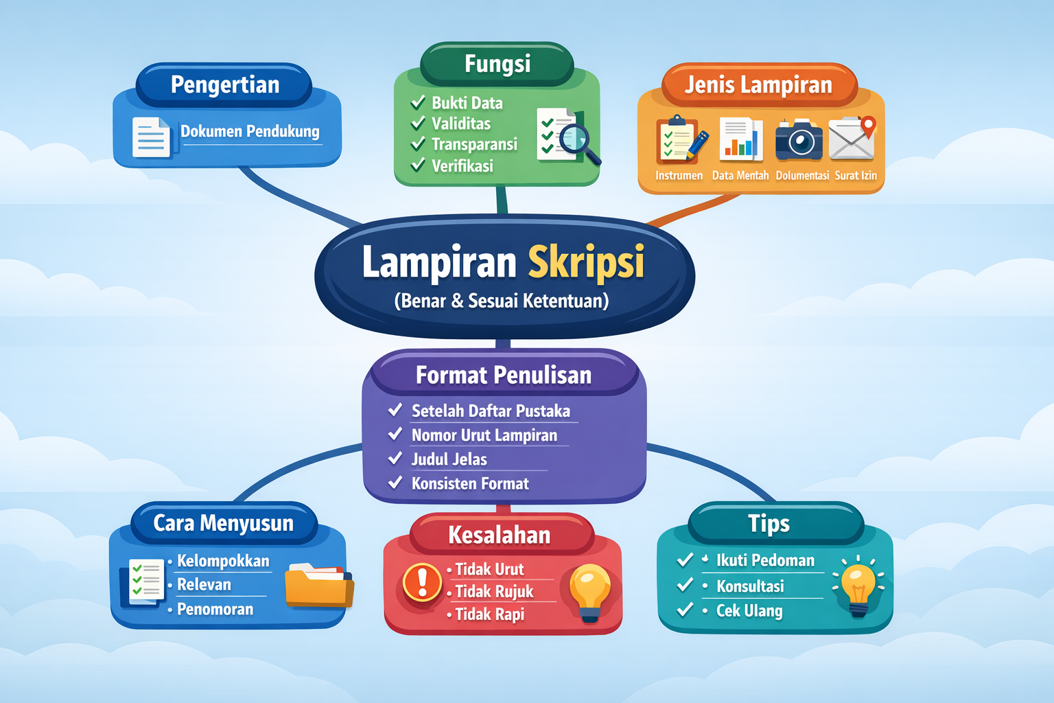 Dengan memahami pengertian, fungsi, jenis, serta cara penyusunannya, mahasiswa dapat menghasilkan lampiran yang rapi dan profesional. Pada akhirnya, lampiran yang baik tidak hanya melengkapi skripsi, tetapi juga meningkatkan kualitas keseluruhan penelitian dan mempermudah proses penilaian oleh dosen pembimbing maupun penguji.