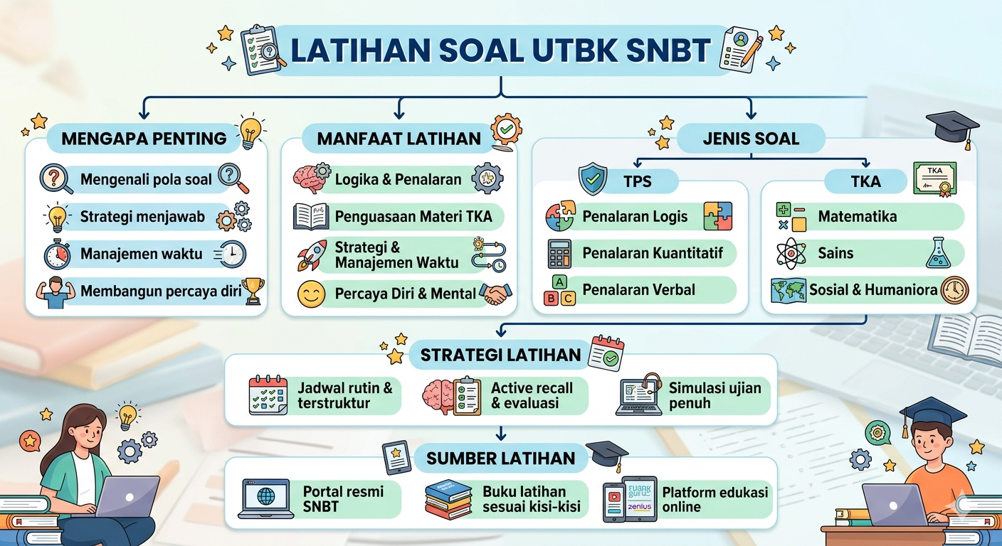Latihan soal UTBK SNBT memiliki peran penting dalam persiapan peserta menghadapi ujian. Dengan rutin berlatih, peserta tidak hanya mengenal tipe dan pola soal, tetapi juga membangun strategi belajar yang efektif. Sebelum membahas manfaat spesifiknya, penting untuk memahami bahwa latihan soal berfungsi sebagai sarana mengasah kemampuan akademik sekaligus mental peserta.
