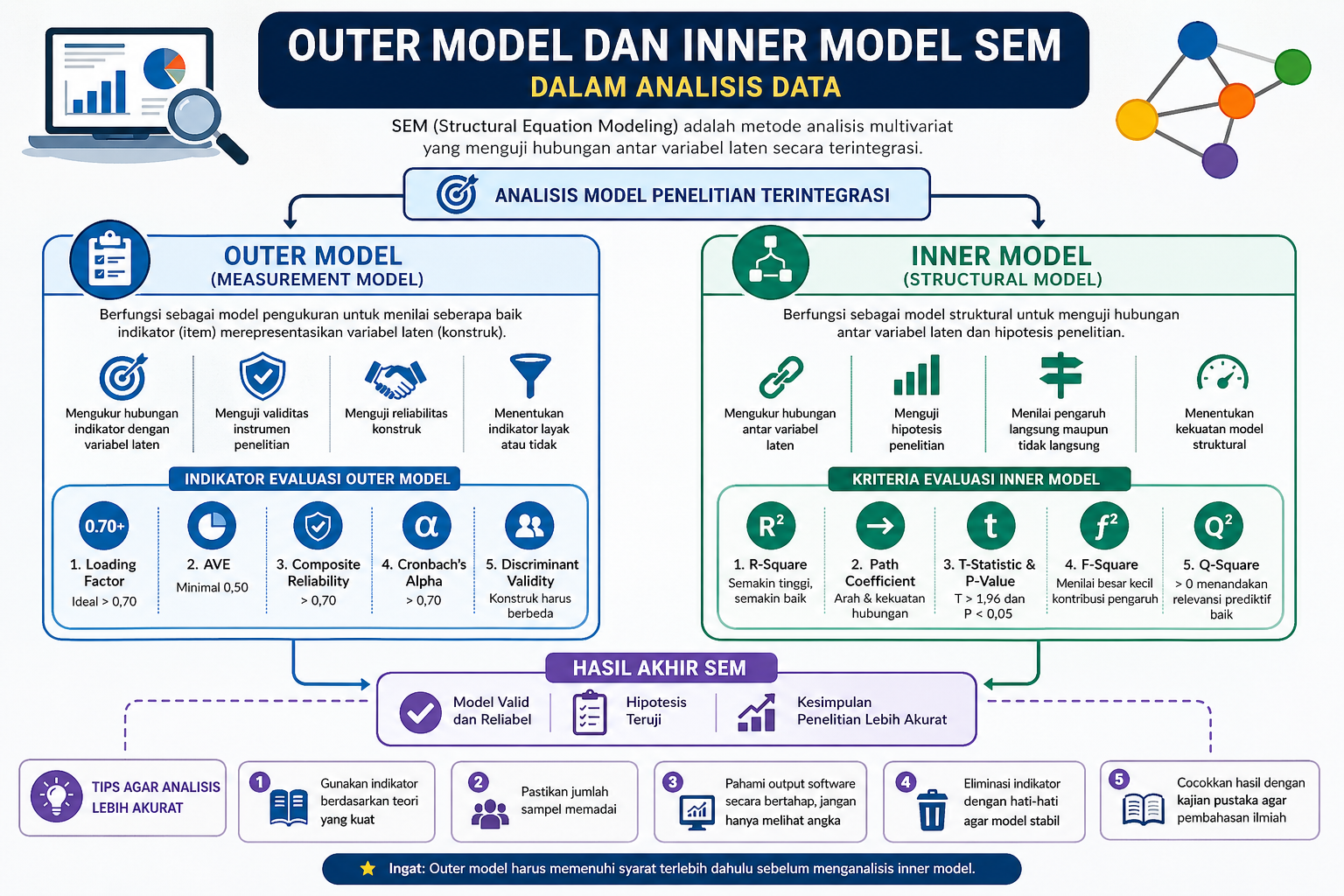 Namun demikian, keberhasilan menggunakan SEM tidak hanya bergantung pada software yang dipakai, melainkan pada pemahaman terhadap dua komponen analisis utamanya, yaitu outer model dan inner model. Banyak peneliti pemula hanya melihat angka signifikansi tanpa memahami apakah instrumen penelitiannya sudah layak dan apakah hubungan variabel yang diuji benar-benar kuat. Padahal, outer model dan inner model merupakan fondasi utama dalam membaca hasil SEM. Oleh karena itu, pembahasan berikut akan mengulas secara rinci mengenai pengertian, fungsi, indikator evaluasi, hingga cara interpretasi kedua model tersebut agar analisis data menjadi lebih akurat.