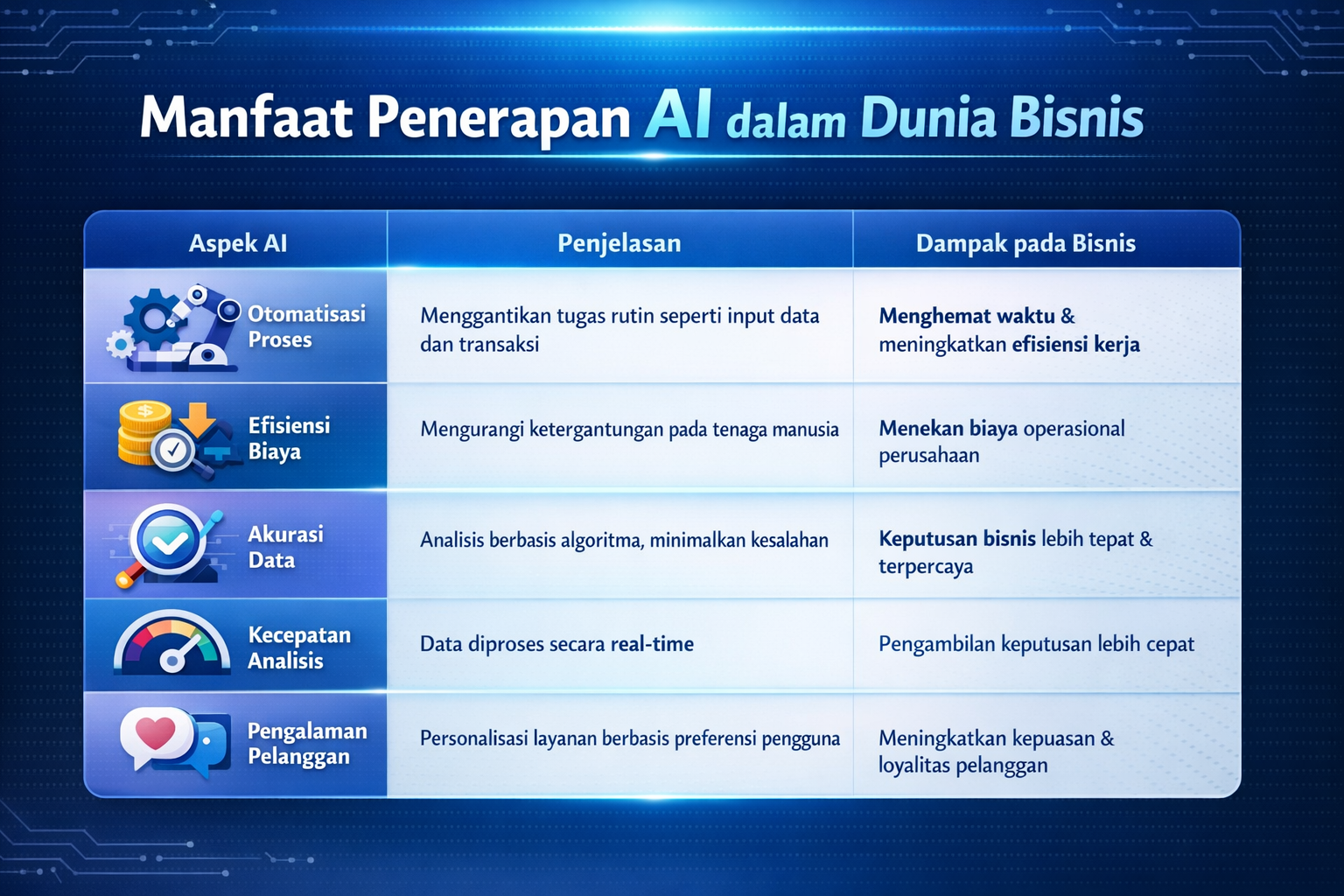Penerapan kecerdasan buatan dalam dunia bisnis memberikan dampak yang semakin terasa, terutama dalam meningkatkan efisiensi dan produktivitas kerja. Melalui kemampuan analisis data yang cepat serta otomatisasi proses, AI mampu membantu perusahaan menjalankan operasional dengan lebih optimal. Oleh karena itu, banyak organisasi mulai mengintegrasikan teknologi ini ke dalam berbagai lini bisnis mereka.