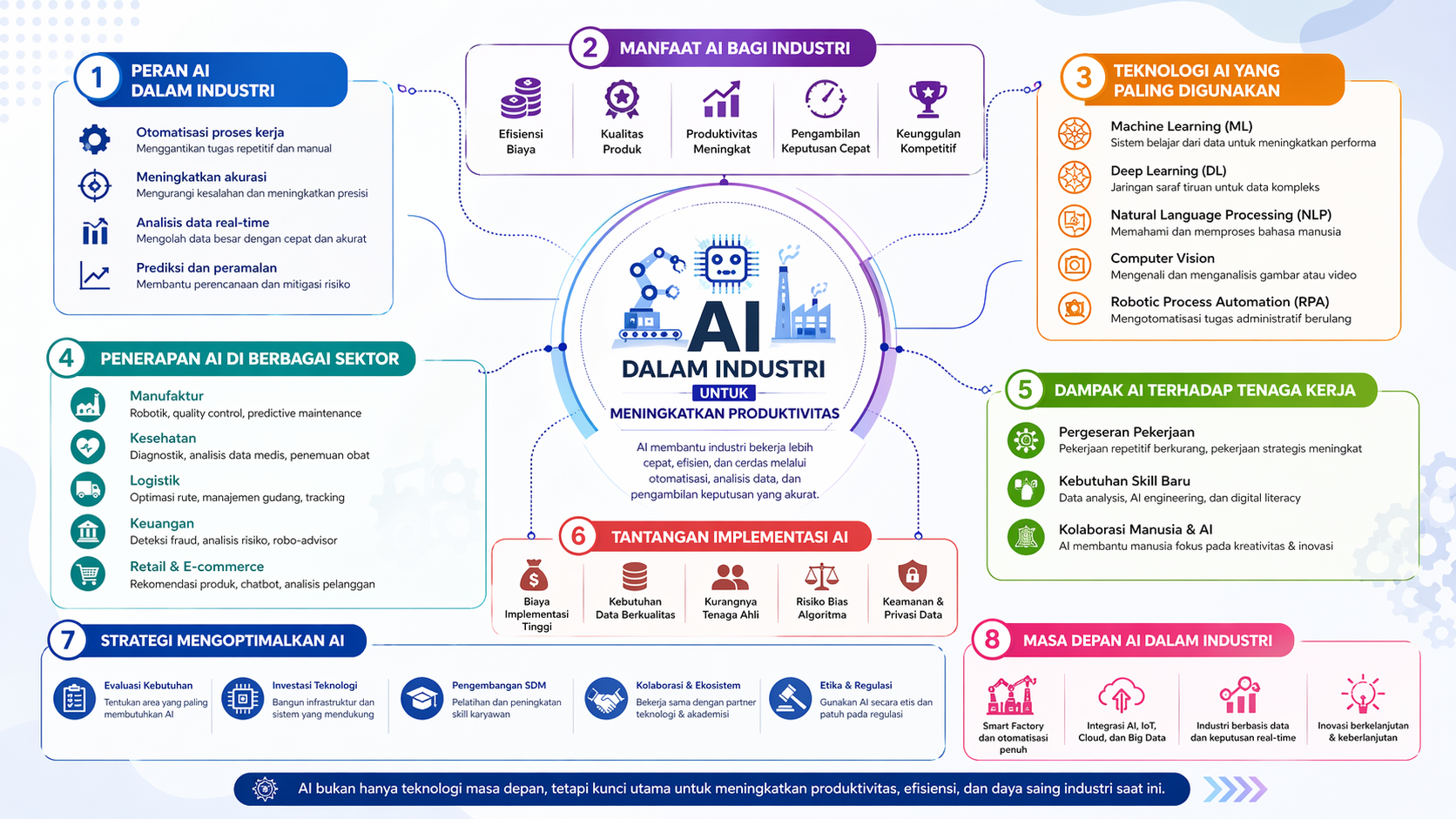 Penggunaan AI dalam industri memberikan dampak yang sangat signifikan dalam meningkatkan produktivitas melalui otomatisasi, analisis data, dan pengambilan keputusan yang lebih akurat. Teknologi ini tidak hanya membantu perusahaan dalam meningkatkan efisiensi operasional, tetapi juga memberikan keunggulan kompetitif di tengah persaingan global yang semakin ketat.