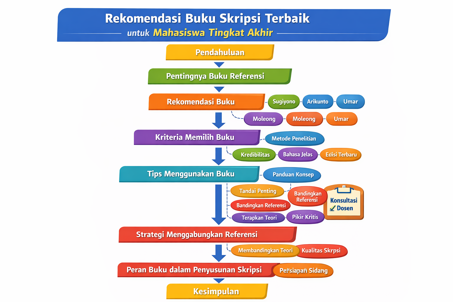 Dengan memperhatikan kriteria ini, mahasiswa dapat memilih buku yang sesuai dengan topik dan metode penelitian, meminimalkan kebingungan, serta memastikan referensi yang digunakan benar-benar mendukung kualitas skripsi.