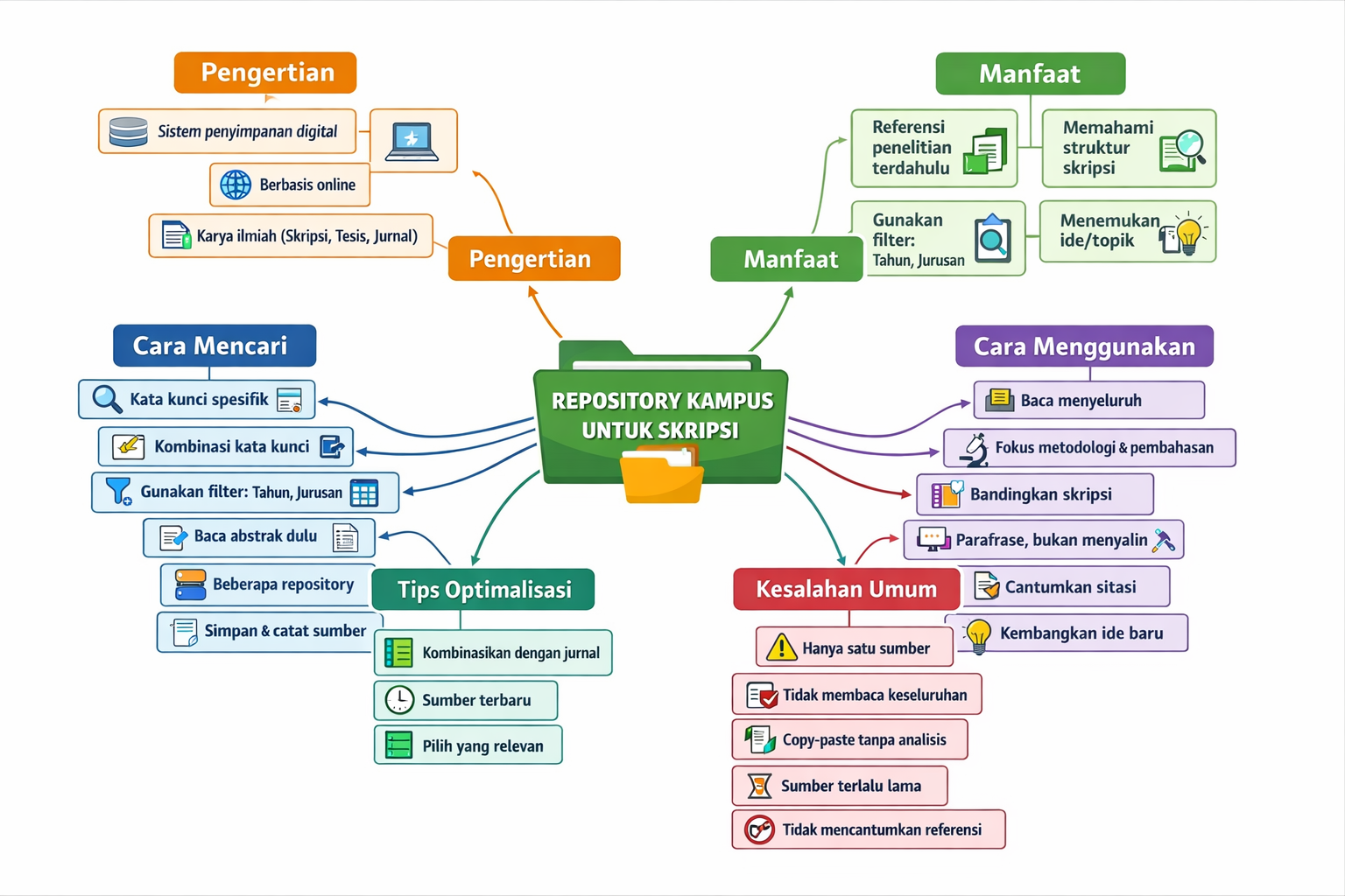 Namun demikian, pemanfaatan repository kampus masih belum optimal di kalangan mahasiswa. Banyak yang hanya menggunakannya sebagai sumber untuk menyalin informasi tanpa melakukan analisis lebih lanjut. Padahal, jika digunakan dengan benar, repository dapat menjadi alat yang sangat efektif untuk meningkatkan kualitas skripsi. Oleh sebab itu, penting untuk memahami secara rinci cara mencari dan menggunakan repository kampus dengan tepat.