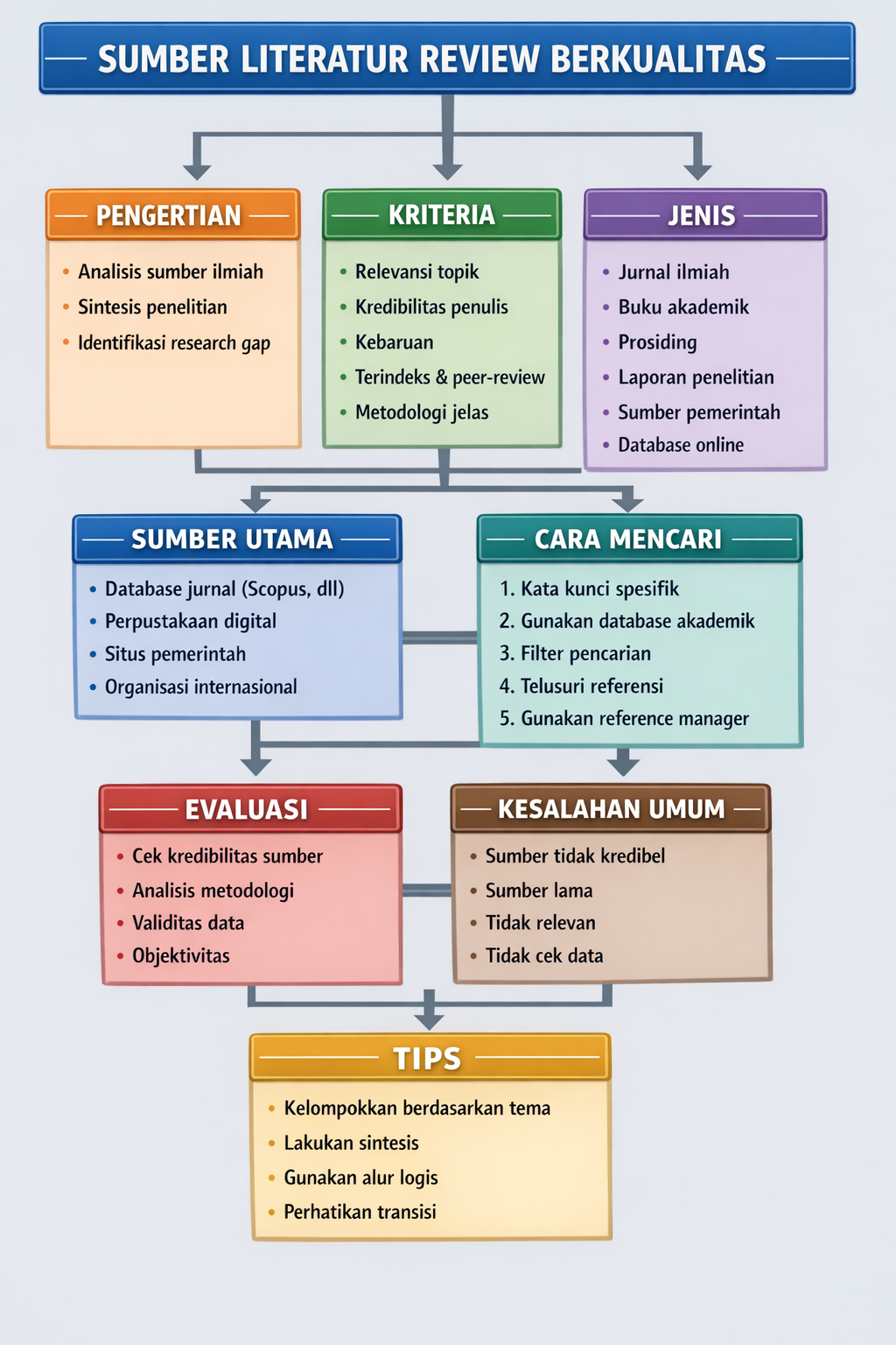 Sumber literatur review yang berkualitas merupakan elemen kunci dalam menghasilkan penelitian yang valid dan dapat dipercaya. Dengan memilih sumber yang relevan, kredibel, dan mutakhir, peneliti dapat membangun dasar teori yang kuat serta memperkuat argumentasi penelitian secara keseluruhan.