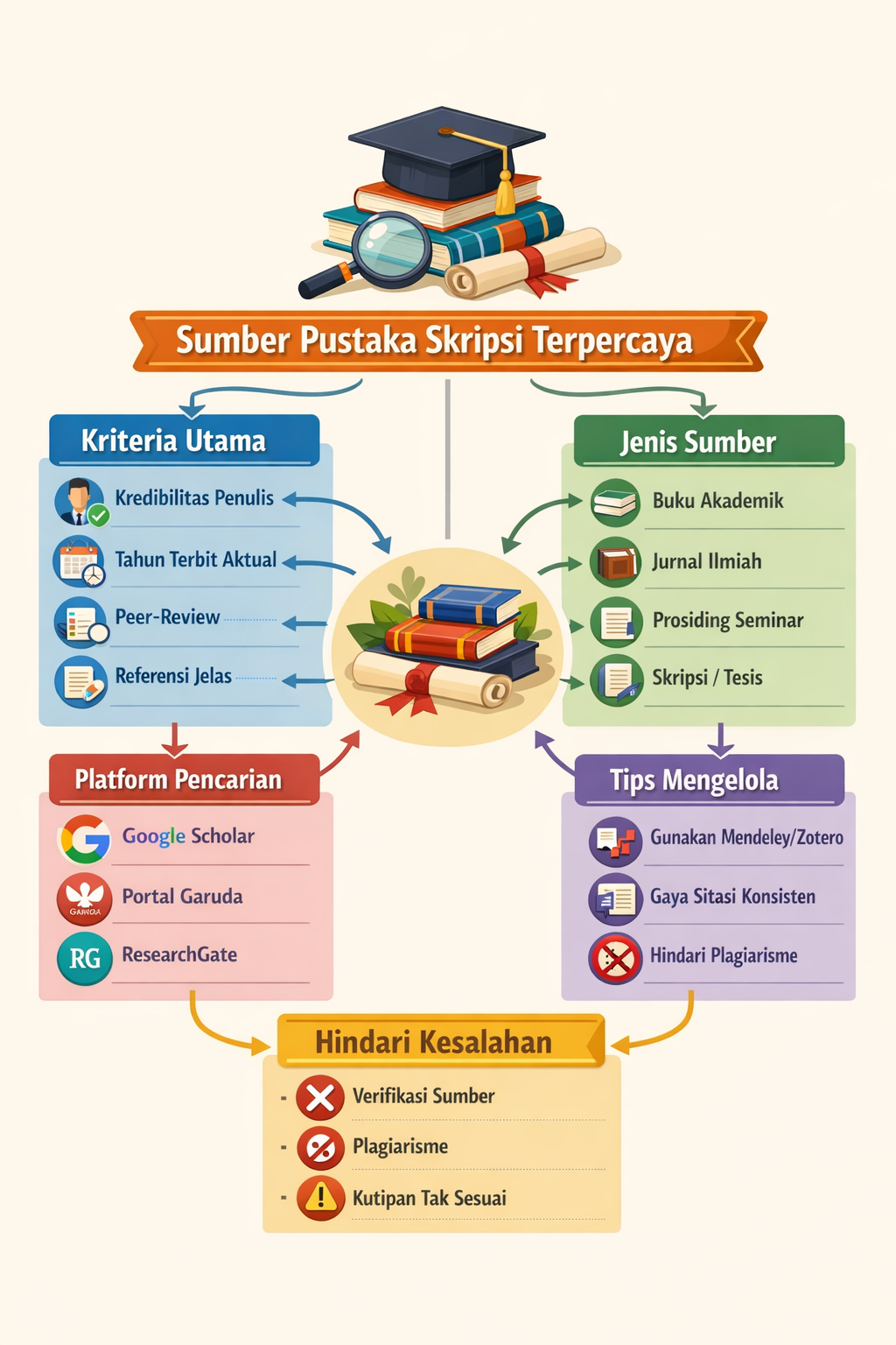 Dalam penyusunan skripsi, keberadaan sumber pustaka yang terpercaya menjadi fondasi utama dalam membangun penelitian yang berkualitas. Referensi yang digunakan tidak hanya berfungsi sebagai pelengkap, tetapi juga sebagai dasar dalam menyusun argumen, memperkuat analisis, serta menunjukkan bahwa penelitian yang dilakukan memiliki landasan ilmiah yang jelas. Oleh karena itu, mahasiswa perlu memahami bahwa kualitas sumber pustaka akan sangat memengaruhi hasil akhir skripsi.