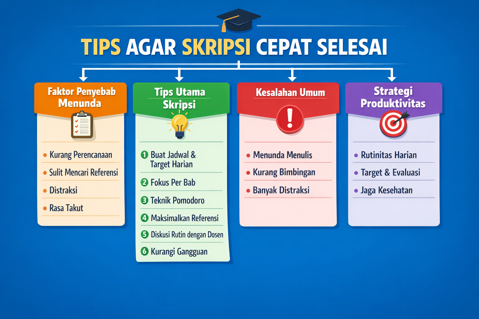 Dengan mengenali kesalahan-kesalahan ini, mahasiswa dapat lebih waspada dan mengatur strategi kerja dengan lebih efektif. Mengetahui hal-hal yang harus dihindari ini menjadi pelengkap dari tips yang sudah diberikan, sehingga langkah-langkah yang dijalankan tidak hanya mempercepat penyelesaian skripsi, tetapi juga membuat prosesnya lebih efisien dan minim hambatan. Pemahaman ini sekaligus menjadi pengantar yang tepat sebelum kita menyimpulkan seluruh pembahasan.