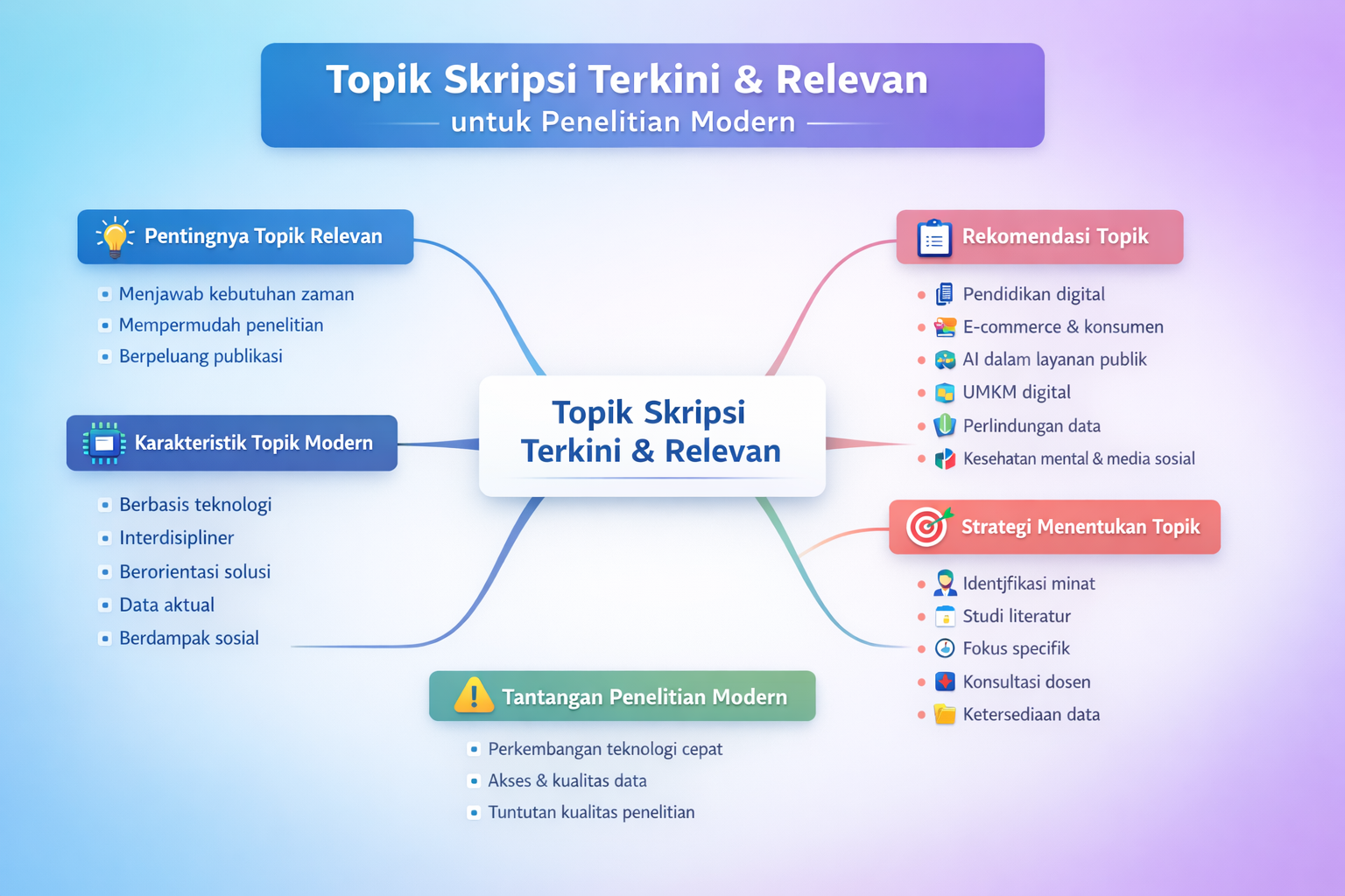 Dalam era perkembangan ilmu pengetahuan dan teknologi yang semakin pesat, pemilihan topik skripsi menjadi langkah awal yang sangat menentukan keberhasilan penelitian. Mahasiswa tidak lagi cukup hanya memilih topik yang mudah dikerjakan, tetapi juga perlu mempertimbangkan relevansi, kebaruan, serta kontribusi terhadap perkembangan ilmu. Oleh karena itu, memahami arah tren penelitian modern menjadi hal yang penting agar penelitian yang dilakukan tetap kontekstual dan memiliki nilai akademik yang kuat.