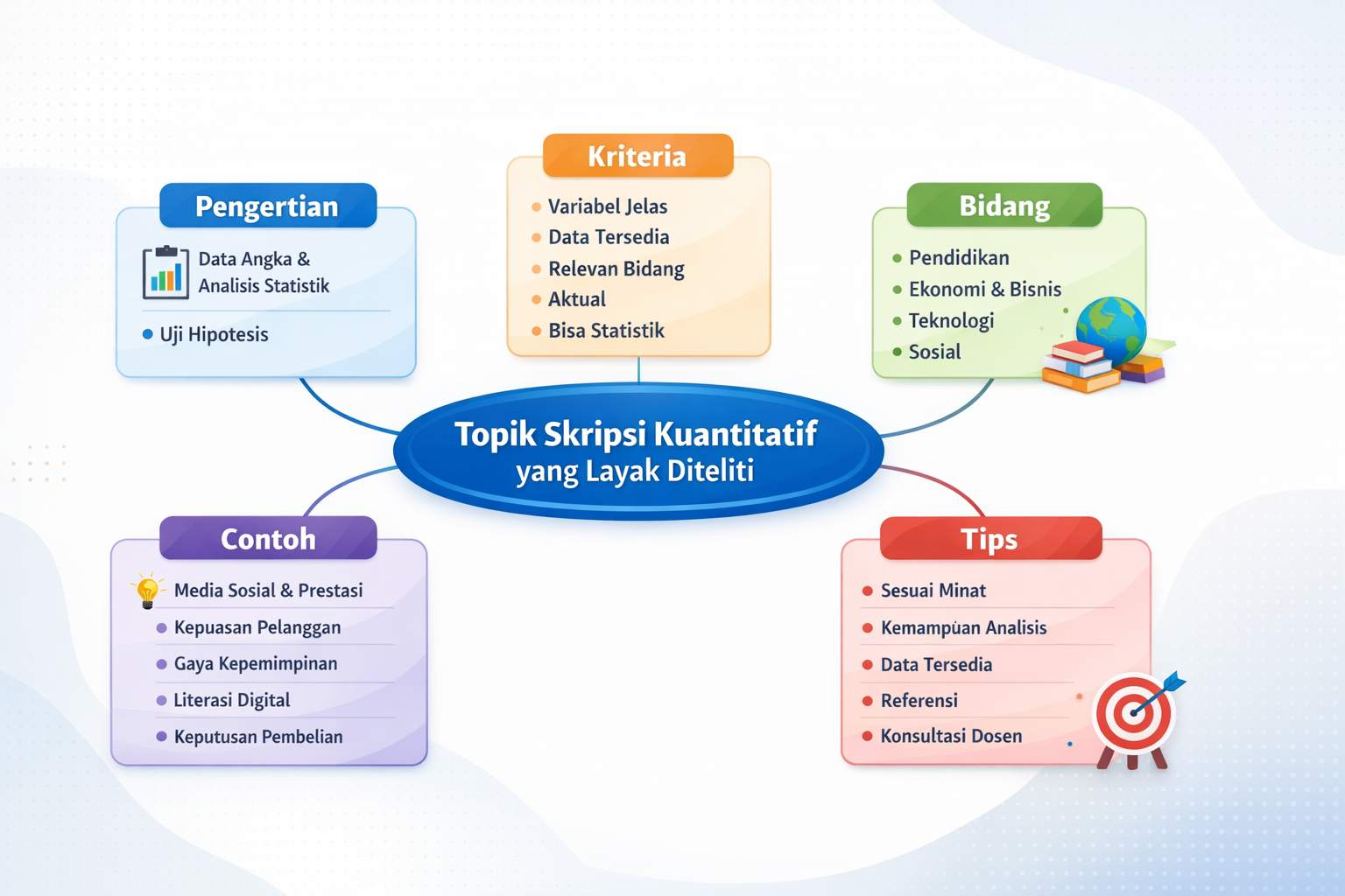 Pemilihan topik skripsi merupakan langkah awal yang sangat krusial dalam proses penyusunan karya ilmiah, khususnya bagi mahasiswa yang menggunakan pendekatan kuantitatif. Pada tahap ini, mahasiswa dituntut untuk mampu mengidentifikasi permasalahan yang tidak hanya menarik, tetapi juga memiliki nilai ilmiah dan dapat diuji secara empiris. Oleh karena itu, memahami karakteristik topik yang sesuai dengan metode kuantitatif menjadi hal yang sangat penting sejak awal perencanaan penelitian.