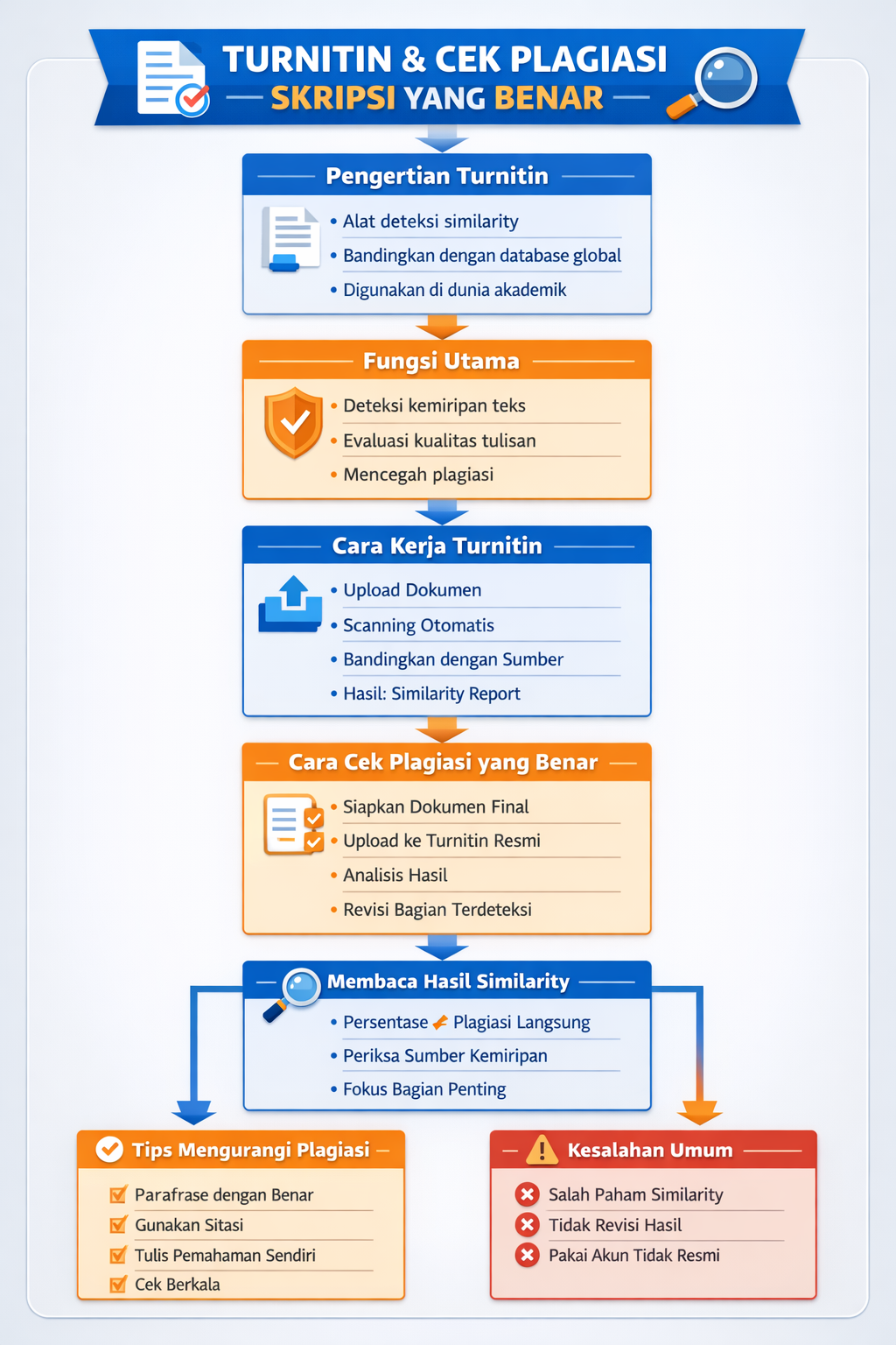 Turnitin merupakan alat yang sangat penting dalam menjaga orisinalitas skripsi, tetapi penggunaannya harus disertai dengan pemahaman yang tepat. Proses cek plagiasi tidak hanya berhenti pada melihat persentase similarity, melainkan juga pada kemampuan membaca laporan secara detail dan melakukan revisi yang sesuai.